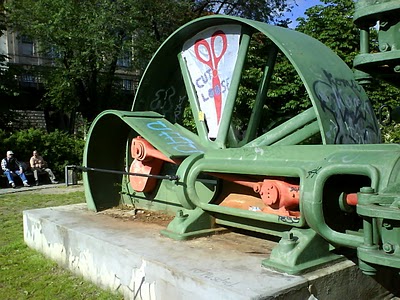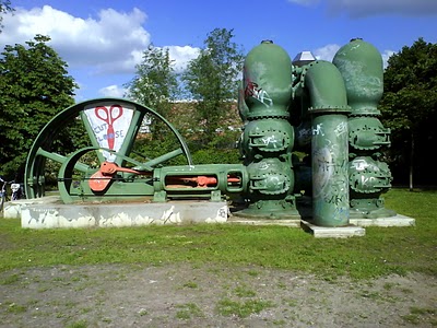 Doppelkolbenpumpe. I was surprised I could find an online translation: double piston pump. Then what is one doing in a scraggly public park, along the Landwehrkanal at Zossenerstraße in Kreuzberg? And what are those two middle aged Hartz IV alkies doing staring in disconcerting concentration?