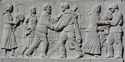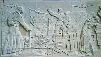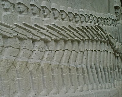 The images on the sarcophagi of the Treptower Park Soviet Memorial (Sowjetische Ehrenmal,1949) are idealised and classical, and very very still. There is no sense of movement in these idealised faces. It is as if the images are copied from daguerrotypes, the subjects asked to stay frozen a long time as their proportions are reproduced. The story of the Second World War depicted here is not furious movement but a waiting game.