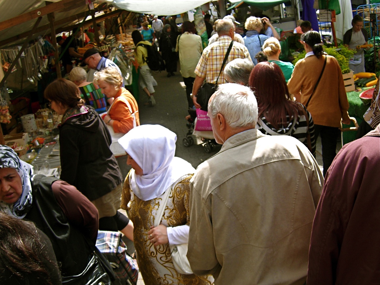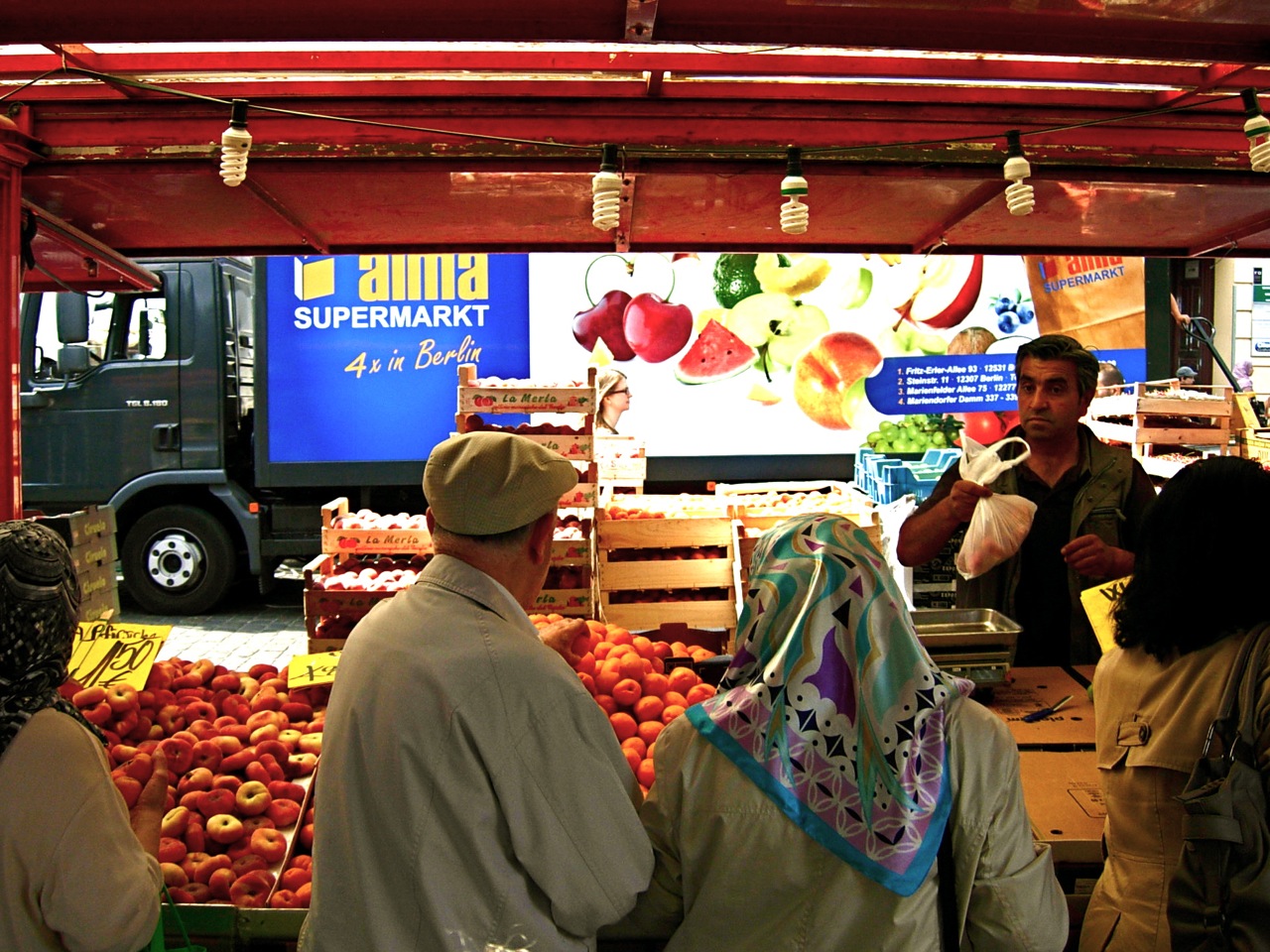 And yet these words are helpful in describing communities that, at least in this neighbourhood, remain largely (but not entirely) segregated. Is the market popular among the ‘Turks’ partly because it is more comfortable culturally than the supermarket aisle? How else do I explain the popularity of stands run here by local ‘Turkish’ supermarkets selling the same food one could buy as conveniently up the street? Sometimes, I go to these empty supermarkets run by ‘Turkish’ families on a market day and find produce as good, perhaps cheaper, and without the hassle. Or is the market buzz part of the attraction? More likely, it’s the end-of-day flash bargains, whole kilos of tomatoes for pennies, that keep the market full.
