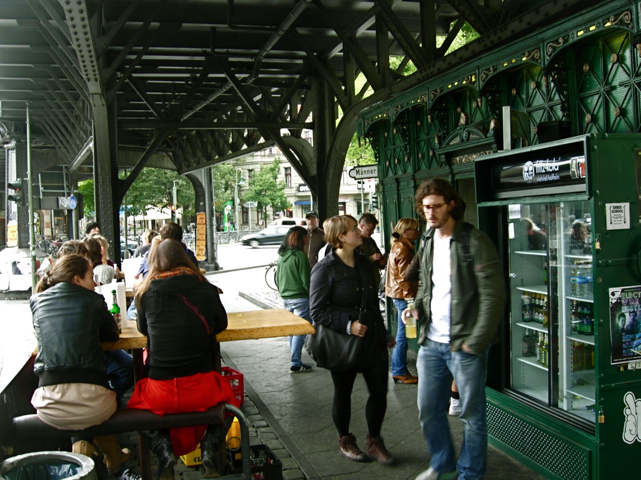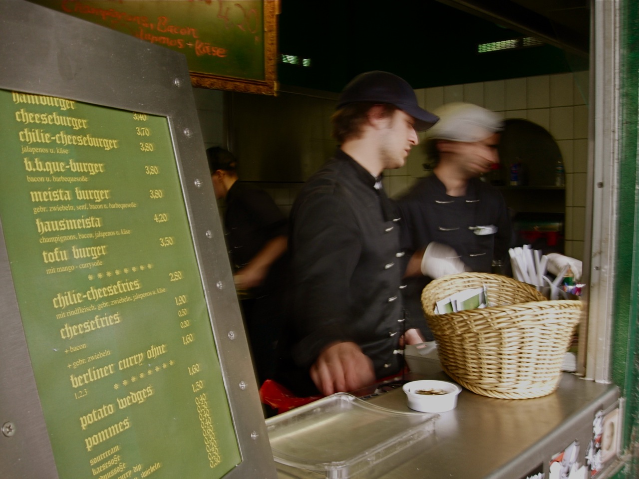 First, close your eyes, and hear the rumble of overhead trains, then the telltale wail of brakes, then laughter of Berliners in transit disembarking, the rush of a passing car, the sizzle of meat and the peal of an electronic bell indicating your order is ready, then doors closing, acceleration, and once more you are on your way.